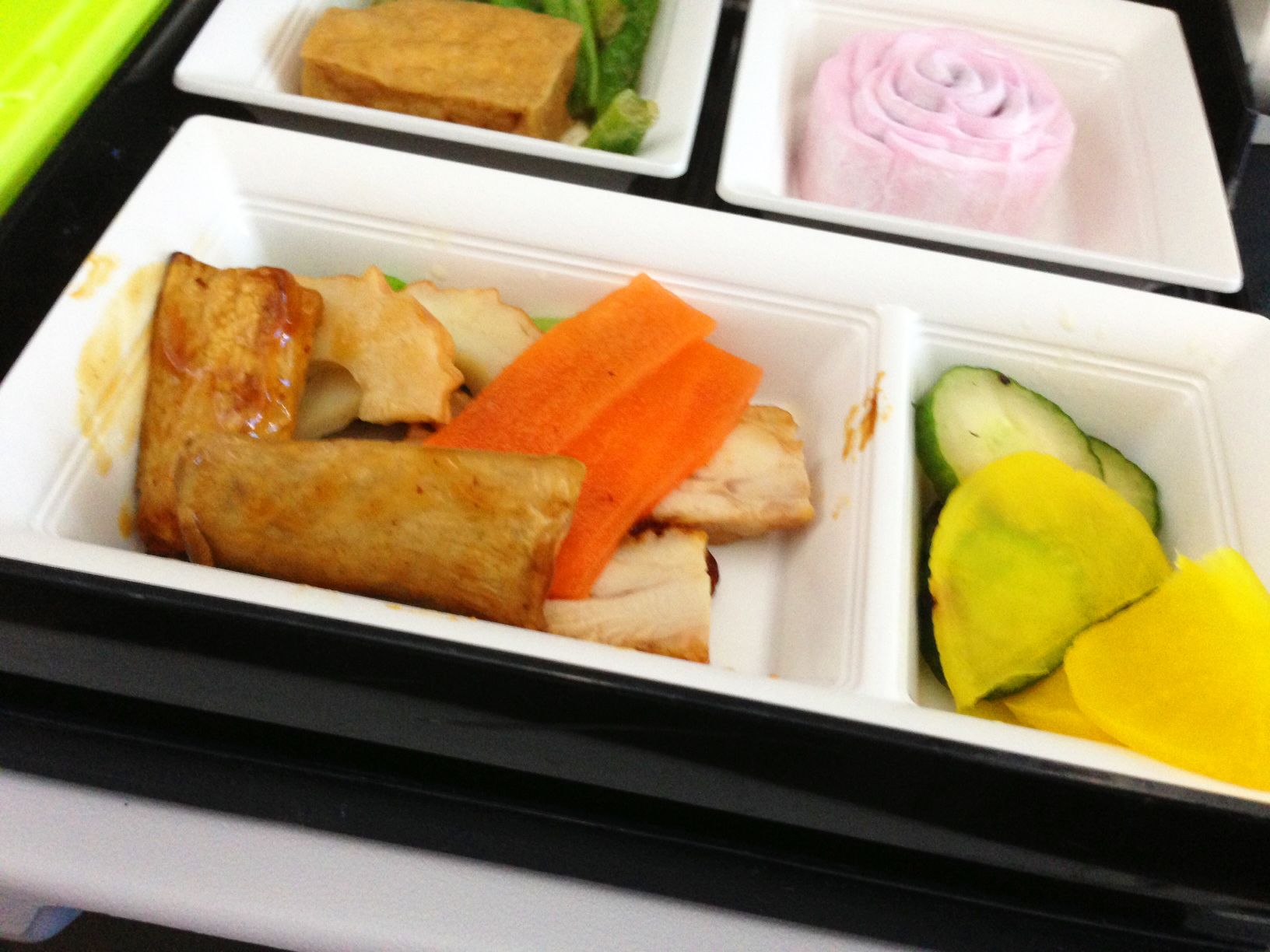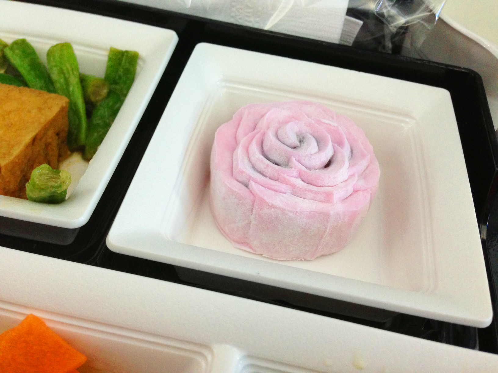 台北松山空港からの羽田行きの機内食です。台北発ということもあったのですが、少し味付けがかなり台湾を意識した味付けとなっていました。個人的にはこのような味付けもアクセントとして面白いと思います。また大福もいわゆる台湾の大福でなかの餡子が甘さを抑えられていてとても美味しかったです。