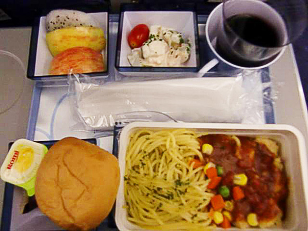チャイナエアーラインの台湾発の別便とほぼ似たようなメニューでした。チキンパスタかビーフライスで選べました。チキンはフライしてあり下味がされています。ソースはデミグラス風。パスタ自体には、下味がほとんどなくソースを絡めて食べました。マヨネーズサラダにはリンゴなどの果物も入っていて全体的に薄味であっさりしてましたが、チキンには衣が付いていて味付けがなされていたのでボリュームは感じられました。