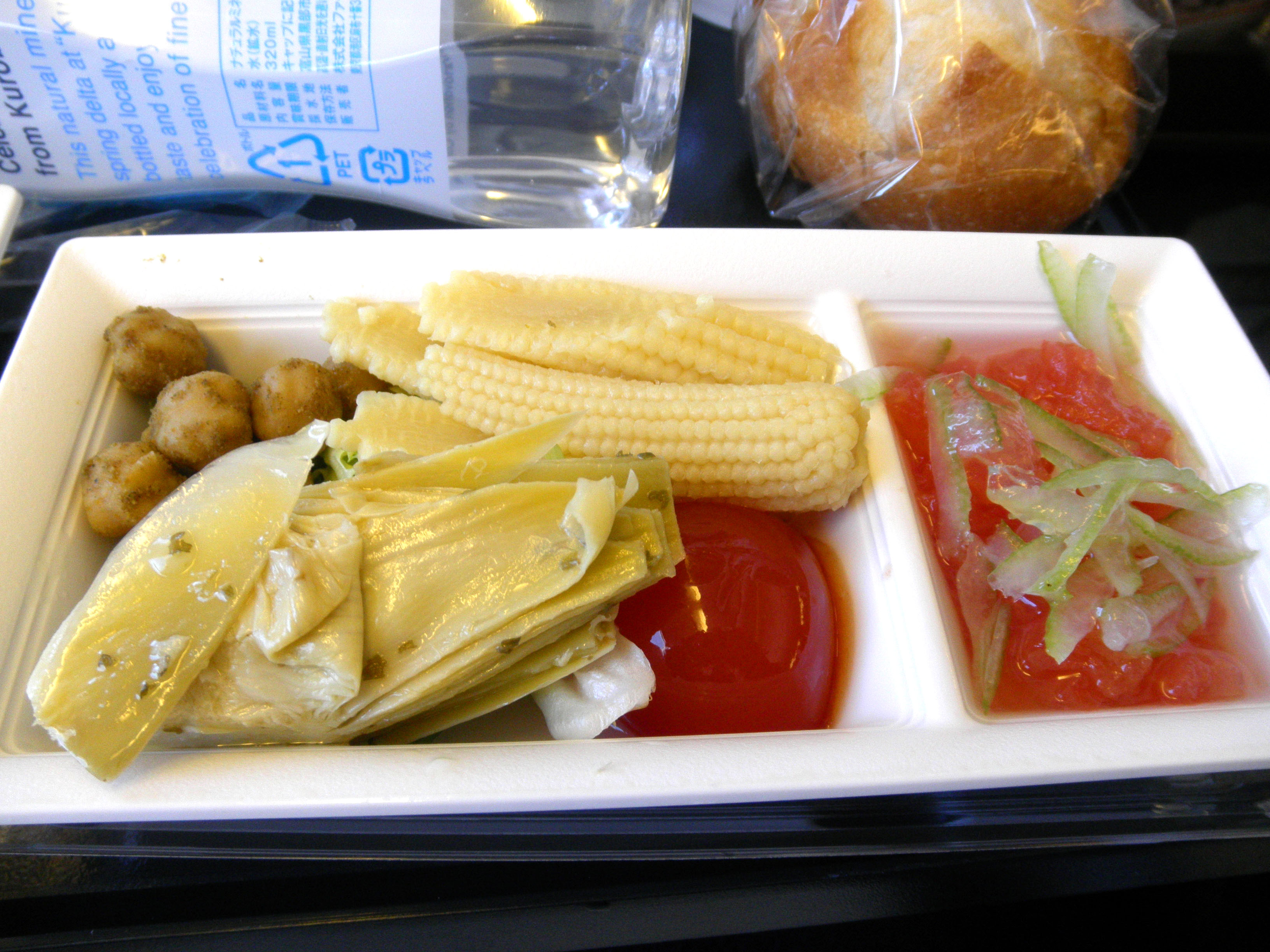 めずらしくおいしいベジタリアンミールでした。特にメインの柔らかいソイミートがおいしかったです。マリネの右手のトマトは甘い味付けで、味のメリハリもありました。ANAは搭乗後すぐにベジタリアンミールの確認があり、その後一番に持ってきてくれるので、忘れられることもなく安心です。食後はハーゲンダッツのアイスクリームのサービスがありますが、乳製品抜きのデザートのサービスはなし。ミニサラダとパンがつきます。