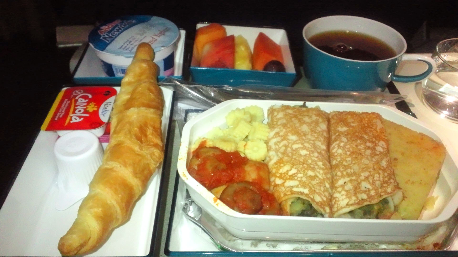 到着前の軽食。私の好みにドンピシャでした。野菜のクレープ包みがとてもおしかったです。細長いクロワッサンも気に入りました。乳製品なしのはずなのになぜかヨーグルトがついていました。材料の英語表記がなかったので、ヨーグルトもどきなのかどうかはわかりませんでした。もしかするとこれは乳製品入りのベジタリアンミールだったのかもしれません。そんなゆるさもお国柄かもしれません。