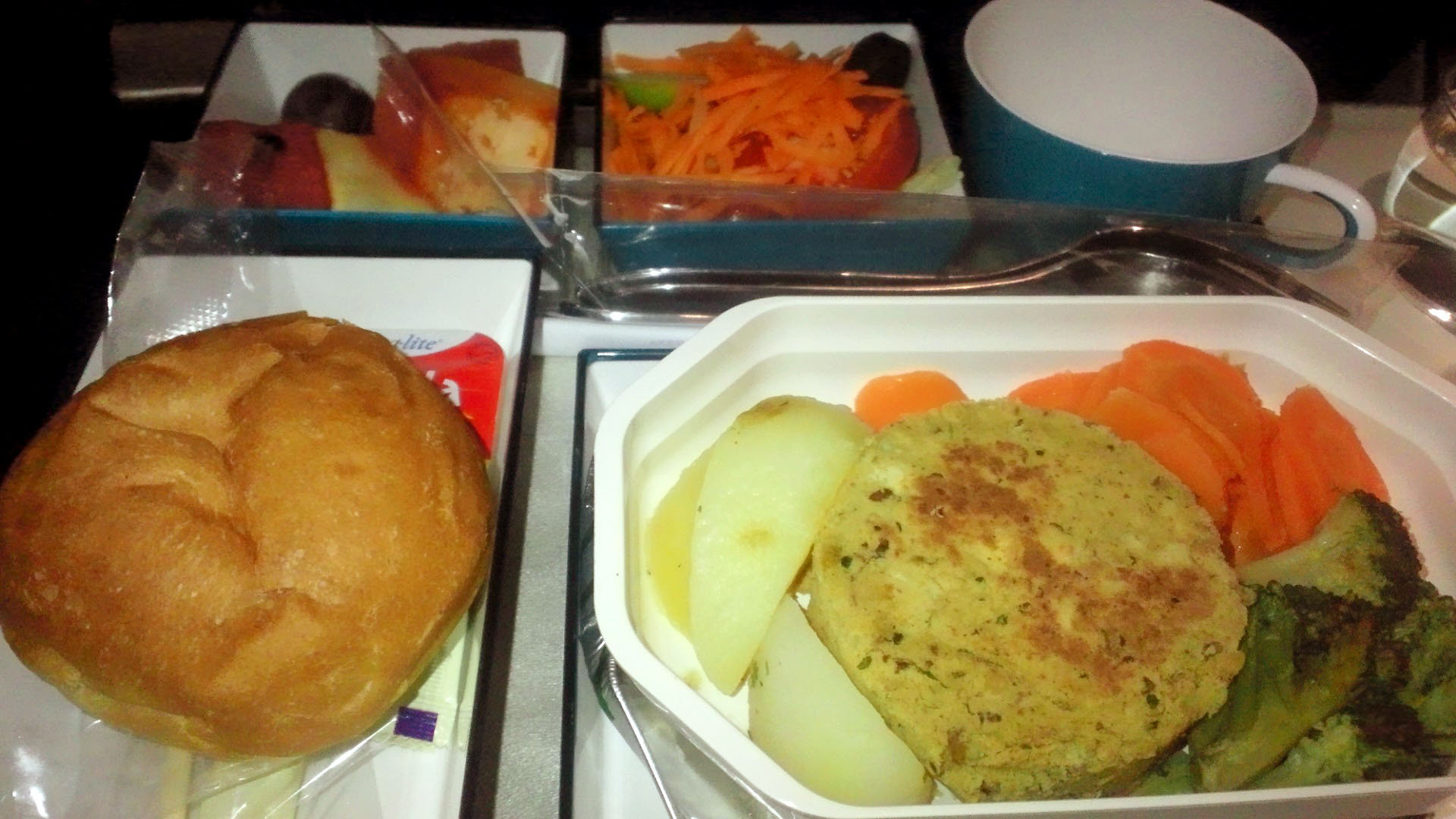 行きとは打って変わって、とてもおいしいベジタリアンミールでした。スパイスが利いたパテがメイン。凝っているし、お腹にもたまって、お味もよし。パテに添えられた温野菜もたっぷりで満足でした。ニンジンの千切りも入ったサラダも食べ応えがあったし、トロピカルフルーツもおいしかったです。毎食こうあってほしいものです。パンは他社と違ってラッピングされていないのですが、普通においしかったです。