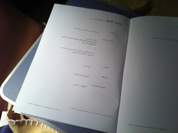 シンガポール深夜発のシンガポール航空の機内食です。離陸後すぐに夕食(夜食)がでてきました。この便はドバイ経由のカイロ行きの便。ドバイカイロ間で2食目(朝食)が出たようです。メニューにはアラビア語のページも。