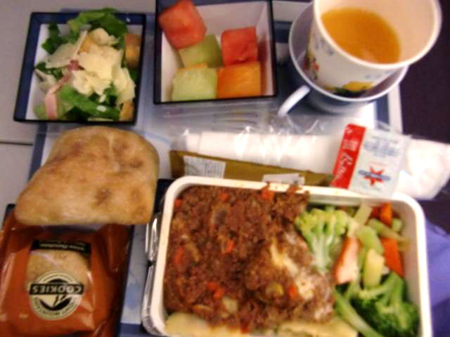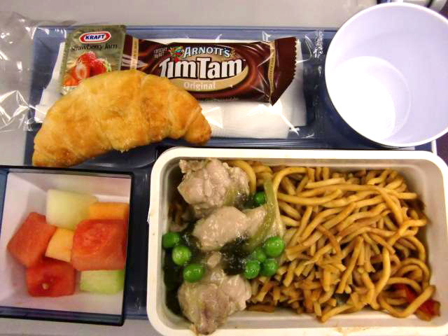 二食目のメインは短い太麺パスタにチキンが添えてありました。チキンにはトロりとした濃厚な味付けがしてありパスタの量も結構ありました。後は、ごく普通のクロワッサンに普通のイチゴジャム。オーストラリアのティムタムといったメジャーなお菓子付で全体的にボリューム満点の機内食でした。