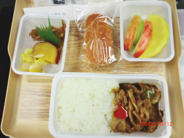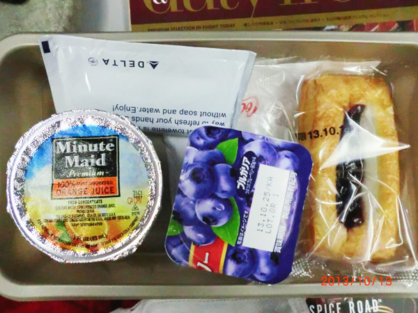 デルタ空港の機内食は微妙と言われていたので覚悟していたが思ったより回鍋肉は美味しかった。(小柱、きんぴらごぼう、サツマイモの甘露煮は微妙)