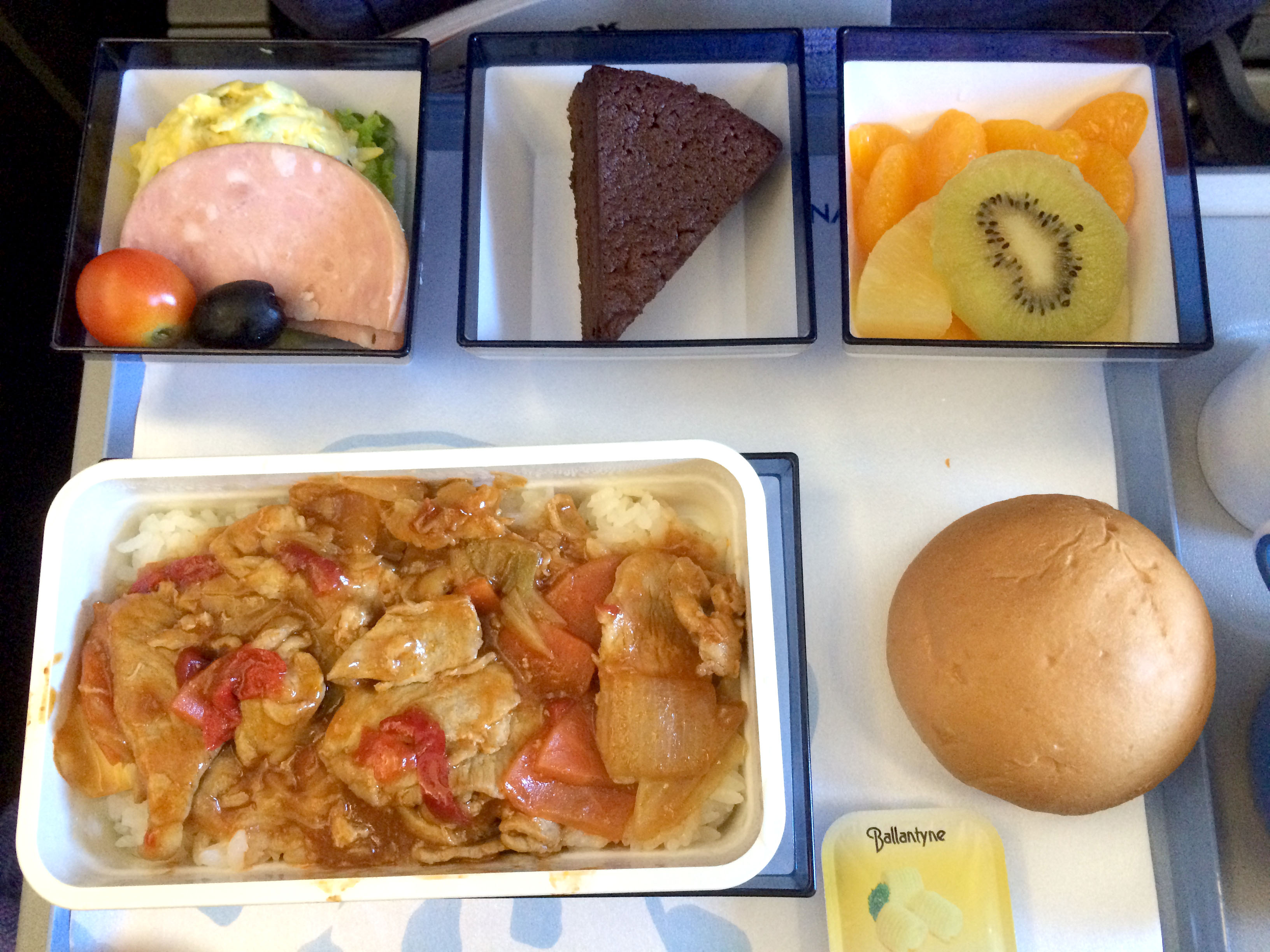 彩りもよく、食器もしっかしていて見た目もおいしそうだし、品数も多くて良かったです。パンも温めてありふわふわでした。トルコライスといものを初めて食べたのですが、豚肉と野菜を甘辛く炒め煮にしてあるのかな?野菜がたくさん入っていて、味はまあまあでした。チョコレートケーキがおいしかったです。ただ、食事中に配られるソフトドリンクはジュースのみで、食後にコーヒーやお茶が運ばれてくるスタイルで、チョコレートケーキと一緒にコーヒーを飲みたかったのに、なかなかコーヒーがこなくてがっかりしました。カトラリーはプラスチック製で割り箸はありませんでした。