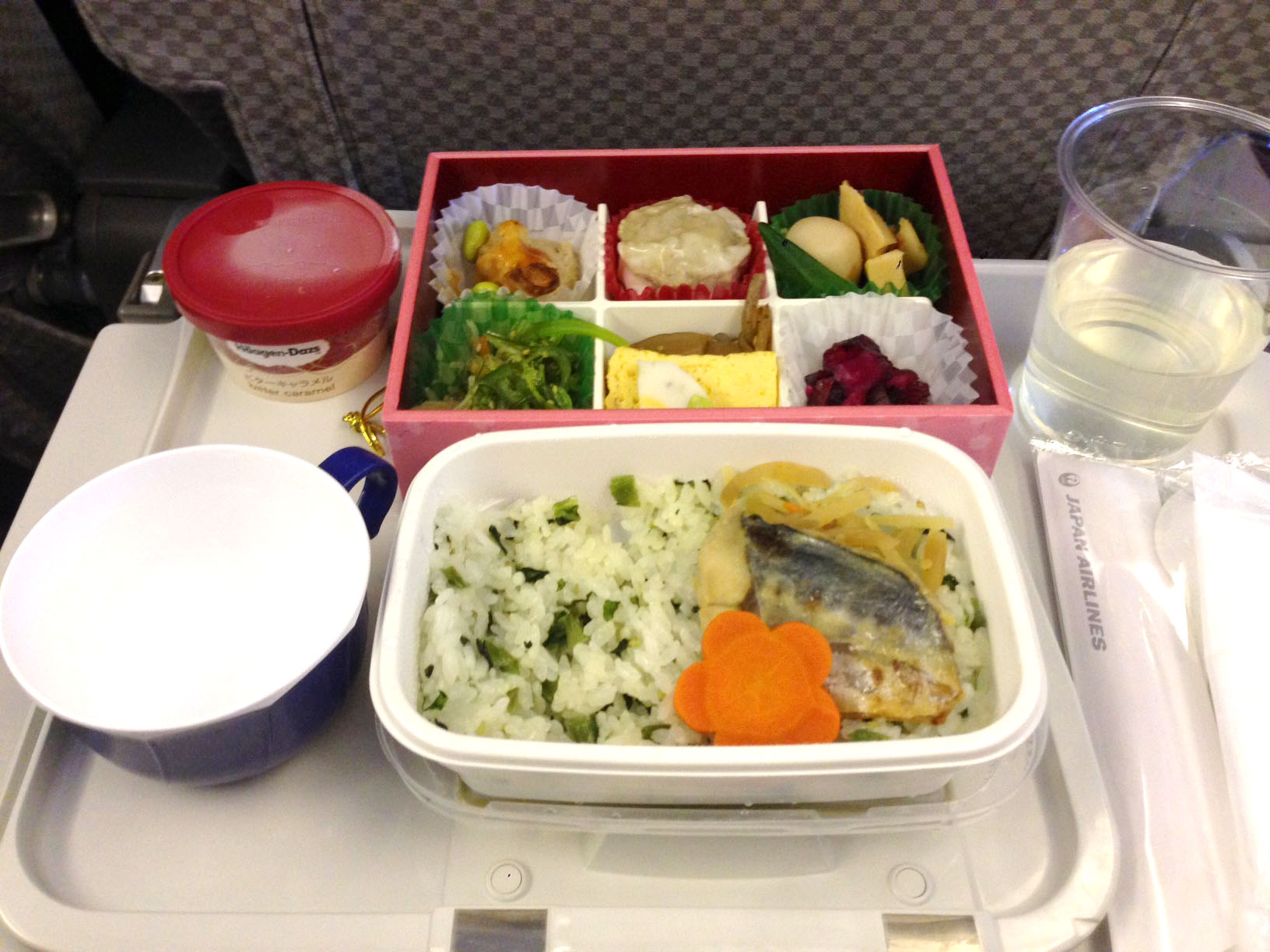 JAL空膳“遊食楽園”「和みの彩り空膳」というお弁当形式のお食事でした。チキンやビーフ等の選択はありません。種類が豊富で見た目はとても華やか。たのしい旅の始まり!という雰囲気になります。但し、シューマイが冷たくて固い!残念でした。