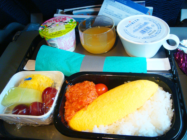 到着前は朝食としてオムレツやヨーグルト、フレッシュフルーツが出てきました。
