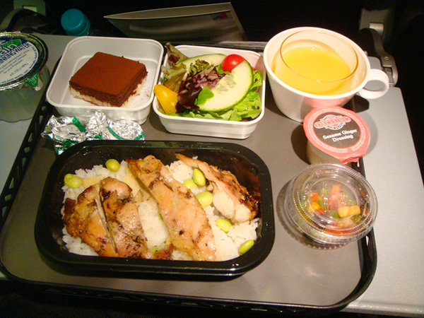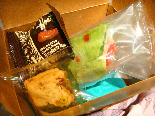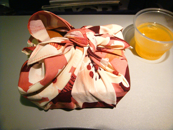 2食目の軽食は、ハワイアン柄の風呂敷に包まれて配布されます。 コチラの風呂敷はお土産として持ち帰り可能という粋なはからいです。 中身は、ロールサンド、クッキー、ナッツとハワイアンテイスト満載で最後の最後まで ハワイを感じさせてくれる機内でした。