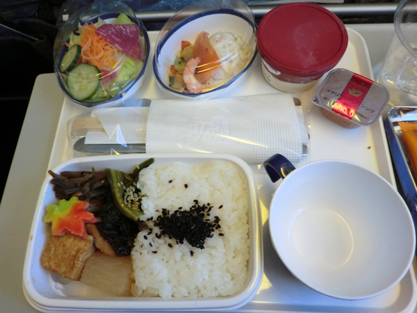 機内食の制約があるのでしょうが、汁気があまり無いとはいえ、煮物とご飯が同じ容器に入っていて残念に思いました。