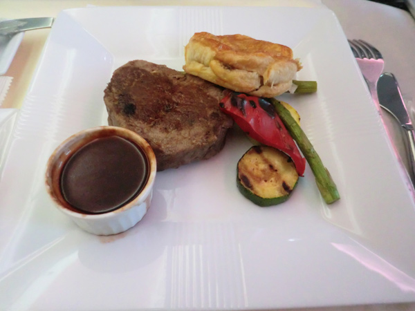 日本発の便の機内食にあった繊細さはオードブルまでで、その分メインディッシュは豪快。「これぞUSビーフ!」というステーキを、これまた米国らしく、パイとこってりソースでいただきます。