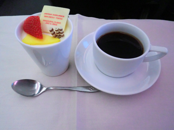 往路便同様、復路便でも、デザートには就航記念の飾りが乗っていました。