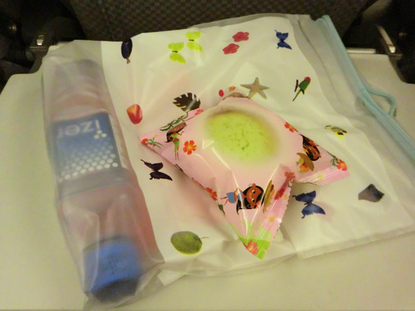 乾燥しがちな機内で蒸しパンを食べる気にはなれず、ミネラルウォーターだけいただき、蒸しパンは到着してからのおやつにしました。