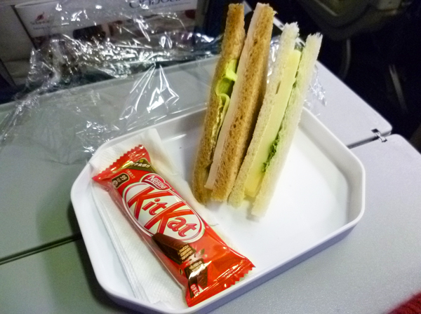 到着前には簡単な朝食「サンドウィッチとキットカット」がでました。