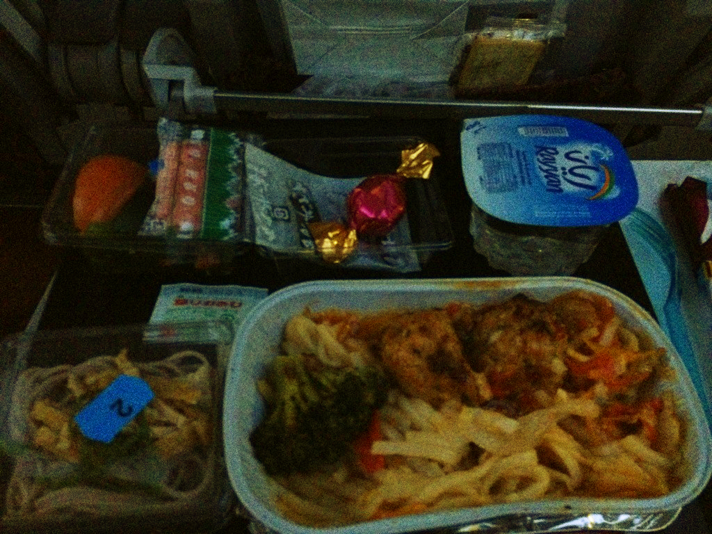カタール航空のエコノミークラスのミラノからドーハ間の機内食です。ミラノからドーハは近距離便ですので、1食のみの提供です。アルコールも提供されビールやワインなどを飲むこともできます。