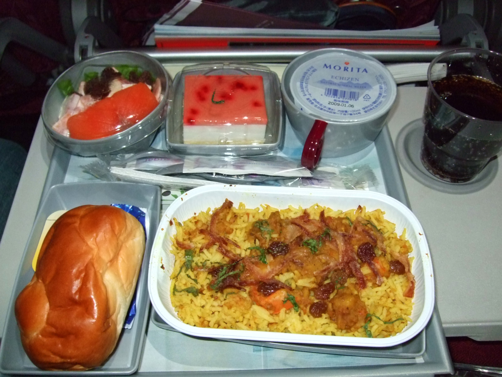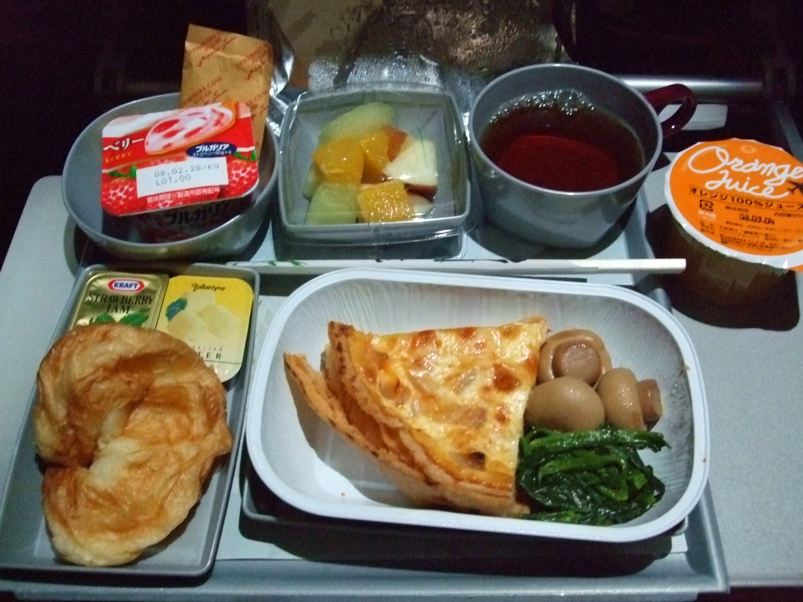 関空発、カタール航空(QR821)便は深夜発です。そのため1回目の機内食は軽めの内容となっています。軽い内容といっても日系航空会社の機内食と比較するとボリュームも充実しています。1回目はライスかキッシュから選ぶことができます。