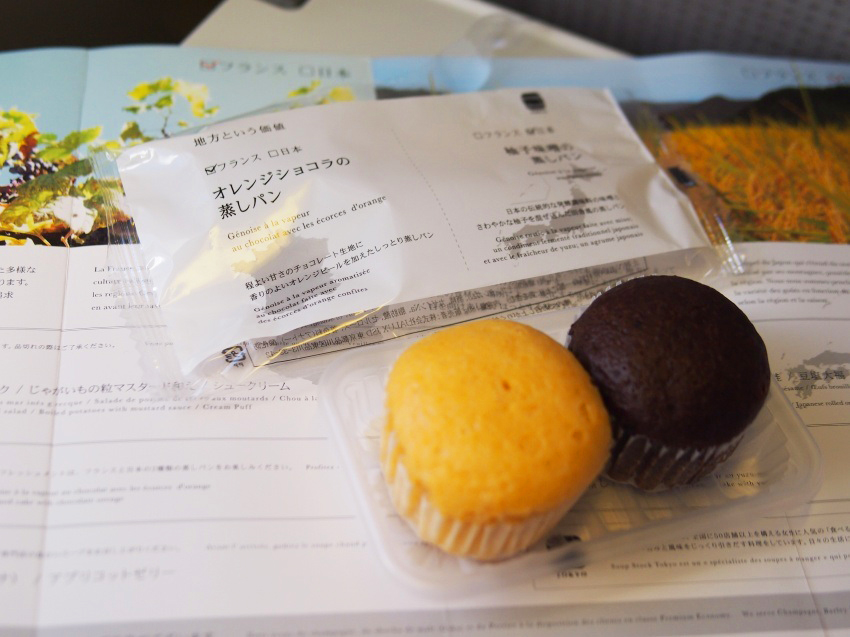 長時間の機内において、ほっとする郷土の味、家庭の味を楽しむことができます。リフレッシュメントとしてオレンジショコラの蒸しパンがだされます。程よい甘さのチョコレート生地に香りのよいオレンジビールを加えたしっとりとした蒸しパンです。オリジナルトレーマットもおしゃれです。